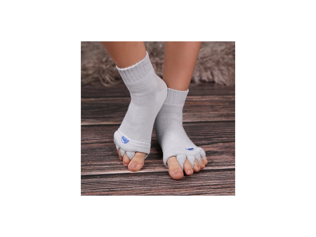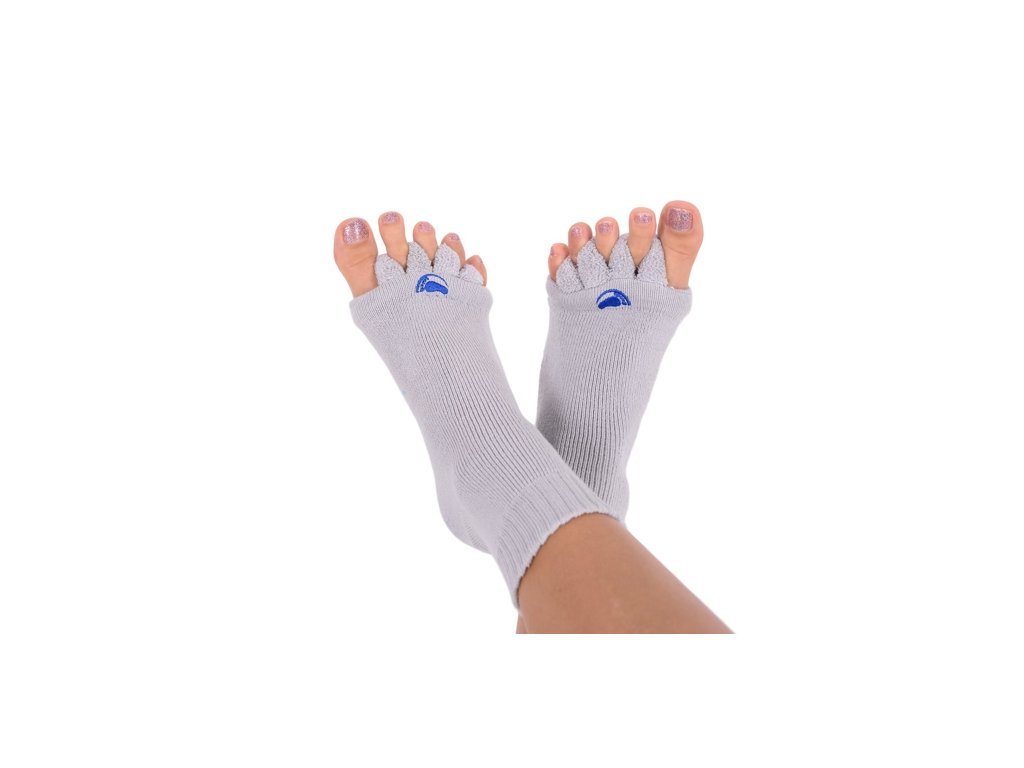 Adjustační ponožky GREY slouží jako terapeutická pomůcka pro nohy. Jemně oddělují a protahují prsty – pomáhají při vbočeném palci, kladívkových prstech, křivých či stísněných prstech a přinášejí úlevu unaveným a bolavým nohám.