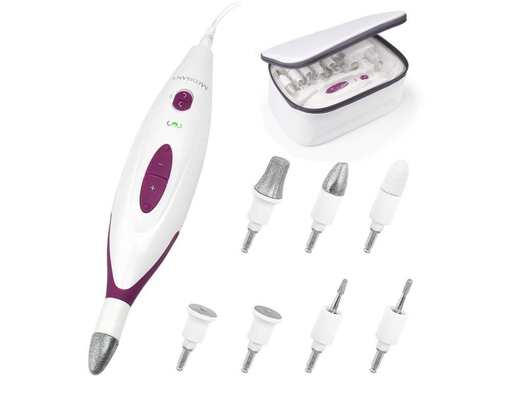 Bruska Medisana MP 815 na manikúru a pedikúru se 7 nástavci je ideálním pomocníkem při ošetření zarostlých, silných a ztvrdlých nehtů, pro ošetření zrohovatělé kůže, mozolů a okrajů kuřích ok. Díky vyměnitelným nástavcům ošetříte různé části Vašeho těla. Bruska je určena pro domácí použití. Safírové nástavce mají dlouhou životnost. Přístroj disponuje 2 směry otáčení, a 2 rychlostmi.